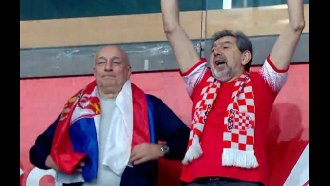 Телевизијска камера уснимила је двојицу навијача, то не би било ништа чудно да један није огрнут српском заставом, а други хрватским шалом. Обојица су се радовали голу хрватског тима.