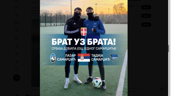 - Брат уз брата. Још један Самарџић у дресу Србије. После Лазара, и други брат из породице Самарџић, Тадија, изабрао је Србију. Ово је још једна потврда поверења које млади таленти из дијаспоре указују српском фудбалу, као и опредељења ФСС да окупи и пружи шансу свим играчима који желе да носе дрес своје земље. Тадија, добро дошао у репрезентацију Србије - објавио је ФСС на друштвеним мрежама.
