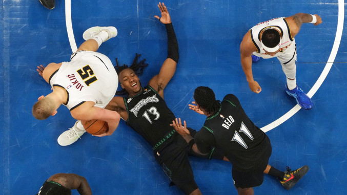 Jaden McDaniels scores with 1.3 seconds remaining and Nikola Jokic takes exception with it pic.twitter.com/NkAjs9RqrW