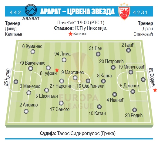 Crvena zvezda danas, protiv Ararat Jermenije na neutralnom terenu u Nikoziji, igra če-tvrtu godinu uzastopno plej-of za plasman u grupnu fazu UEFA takmičenja. Za razliku od minule dve sezone u presudni meč ne ulazi sa već obezbeđenom evropskom kartom za takmičenje do decembra i ne može u Ligu šampiona. Na mestu gde je šokantno poražena od Omonije, pokušaće da savlada rivala iz Jerevana i uđe u Ligu Evrope.