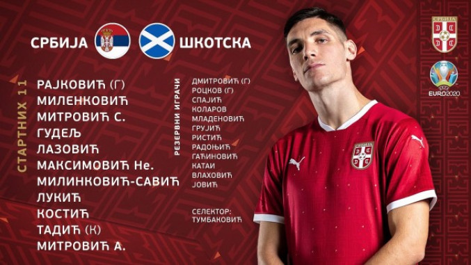 Selektor Ljubiša Tumbaković odredio je startnih 11 za meč sa Škotskom: Rajković, Milenković, S. Mitrović, Gudelj, Lazović, Ne. Maksimović, Milinković-Savić, Lukić, Kostić, Tadić, A. Mitrović.