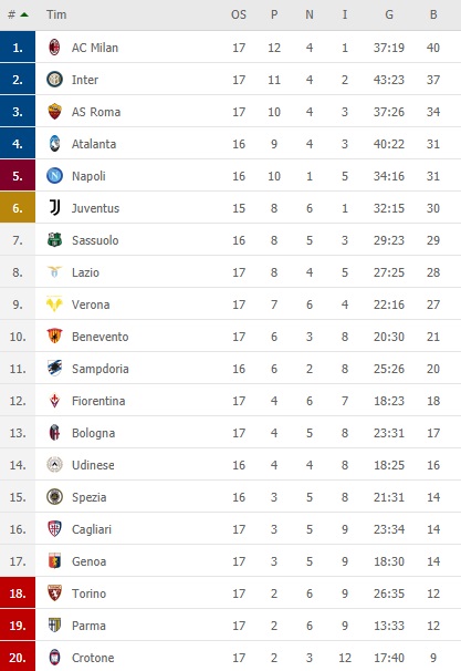 Fjorentina je 12. sa 18. bodova, dok je Kaljari upisao 14 bodova i zauzima 16. mesto.
