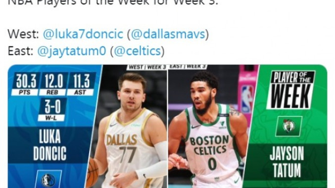 Košarkaš Dalasa Luka Dončić proglašen je za najboljeg igrača Zapadne konferencije u trećoj nedelji aktuelne NBA sezone, saopštila je najjača košarkaška liga na svetu.