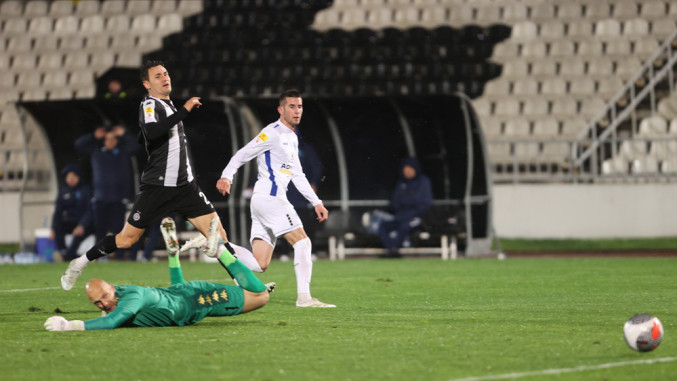 Imao je Partizan šansu da poluvreme dočeka bez minusa. Golman Zoran Popović je izleteo u prazno, ali Jovan Milošević je sa par metara pogodio stativu.