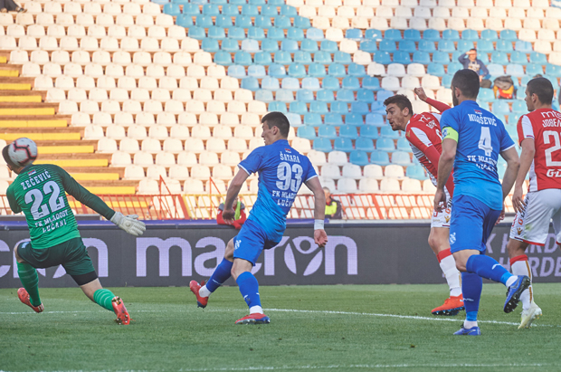 32` Prvi šut ka Borjanovom golu, sa 25 metara je pokušao Sinđić, ali je na opvom meču kapiten crveni-belih bio odlično postavljen.