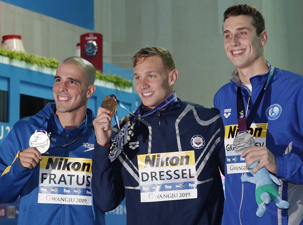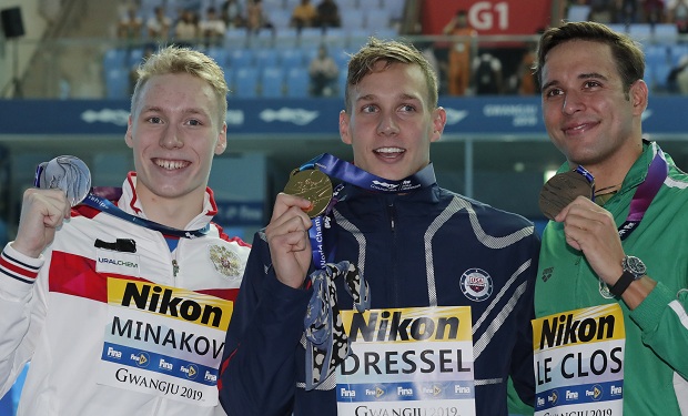 Američki plivač Kejleb Dresel osvojio je danas još tri zlatne medalje na Svetskom prvenstvu u Južnoj Koreji - na 50 metara slobodno, 100 metara delfin i u mešovitoj štafeti 4x100 slobodno.