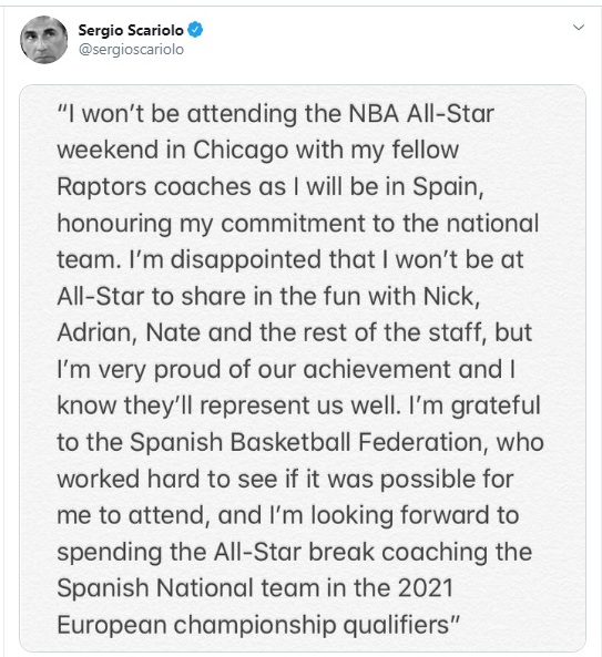 Skariolo je za obaveze u španskom državnom timu imao razumevanje Toronta, kao što Igor Kokoškov ima podršku u Sakramentu. Italijanski stručnjak je tim povodom objavio poruku na Tviteru: