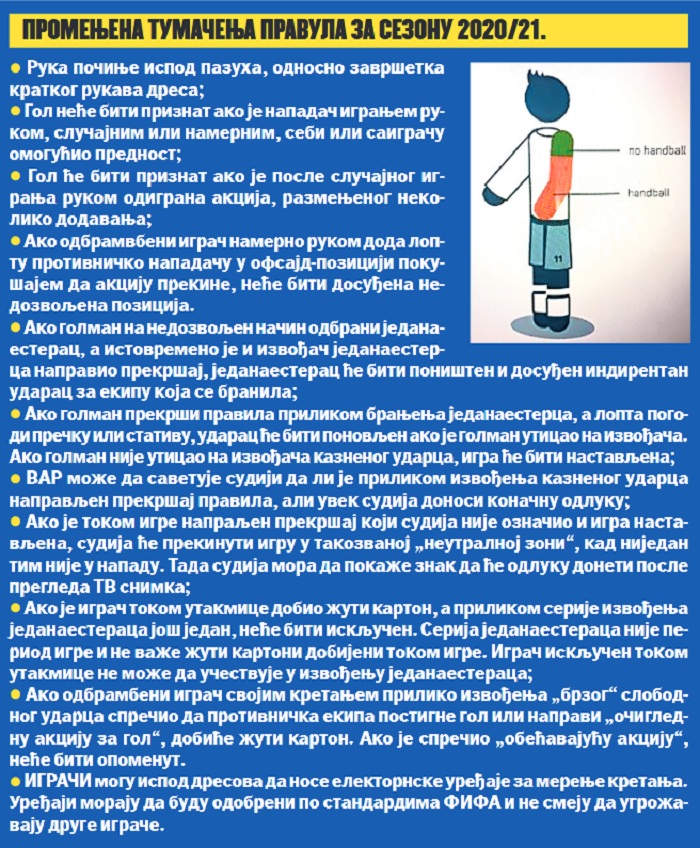 Nejasnoće oko dosuđivanja igranja rukom ubuduće bi trebalo da otkloni odluka Borda da ruka počinje ispod pazuha, odnosno tamo gde se završava kratki rukav. Da bi bilo jasnije, Bord je sudijama ponudio i grafiku.
