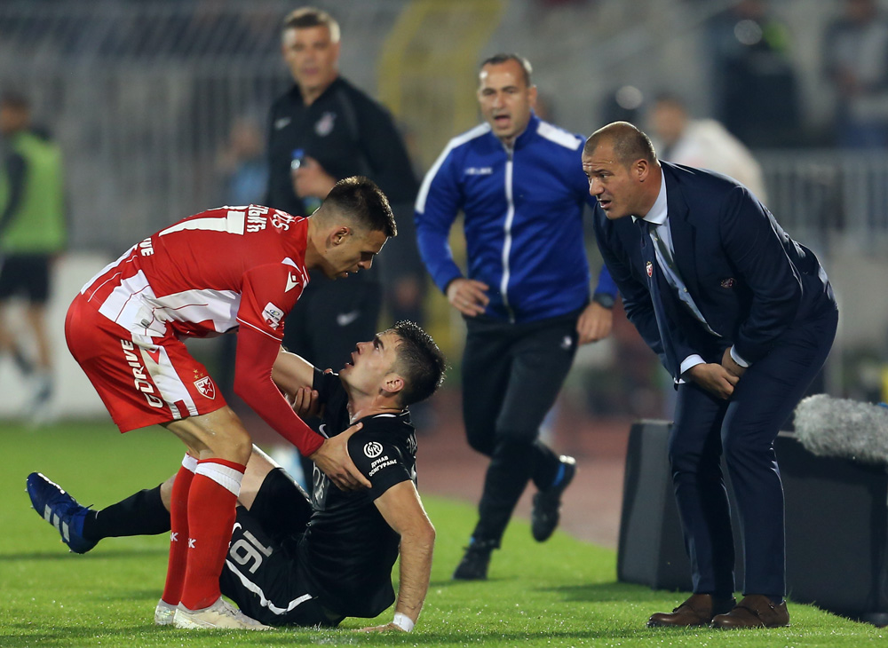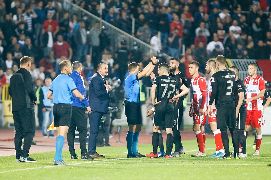 37. minut: Zdjelar je krenuo da izvede aut, van terena oborio ga je Gobeljić, sve se desilo kraj klupe crveno-belih. Stvorila se gungula, dvadesetak igrača i članova stručnih štabova našlo se u klinču. Kada se situacija smirila, Zdjelar i Gobeljić su dobili po žuti karton.